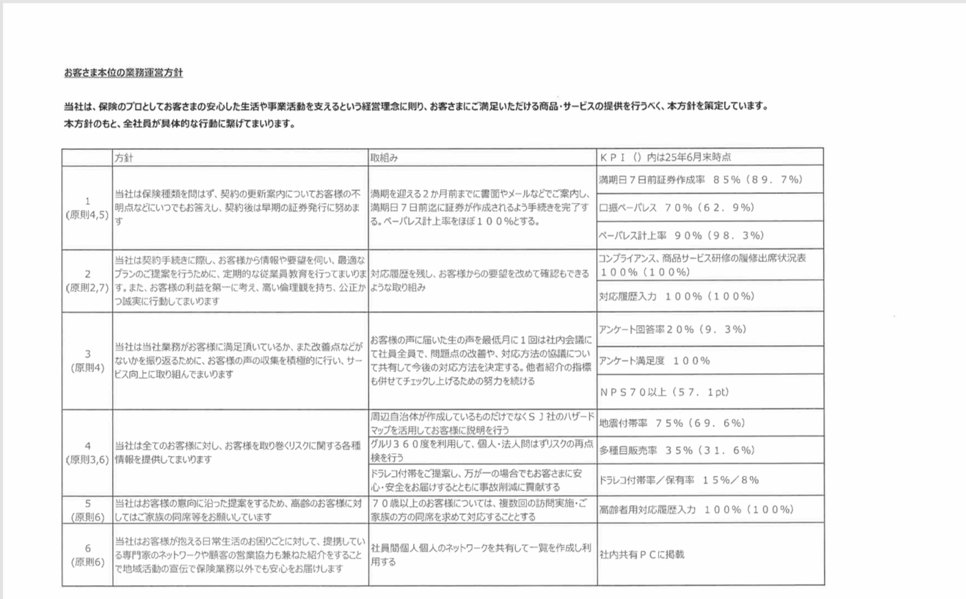 - お客様本位の業務運営方針 当社は、保険のプロとしてお客さまの安心した生活や事業活動を支えるという経営理念に則り、お客さまにご満足いただける商品・サービスの提供を行うべく、本方針を策定しています。本方針のもと、全社員が具体的な行動に繋げてまいります。